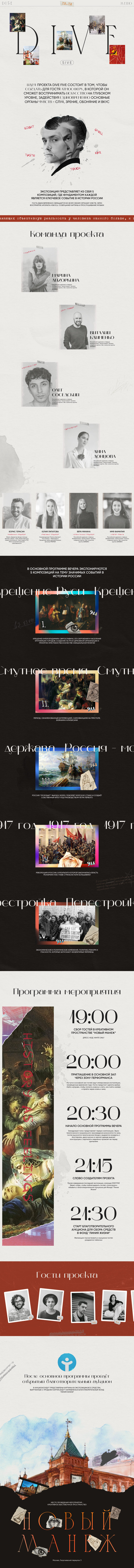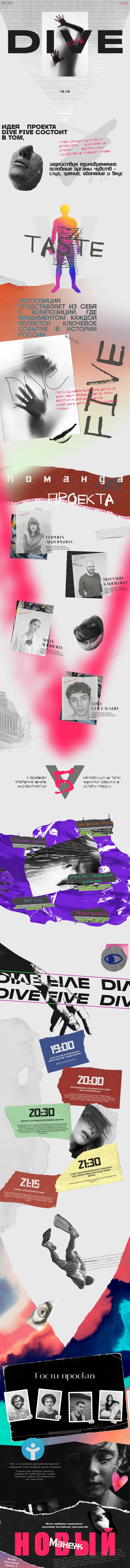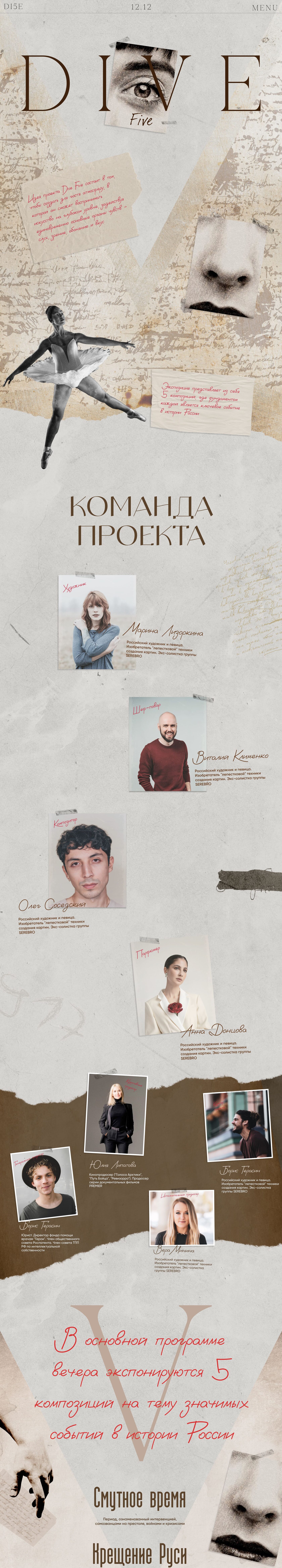 Dive 5 — это офлайн мероприятие, на котором представлены 5 произведений искусства, посвящённые ключевым событиям в истории России. Гости единовременно обращается ко всем органам чувств, через восприятие аромата и вкуса, созерцание картины и прослушивание музыки.