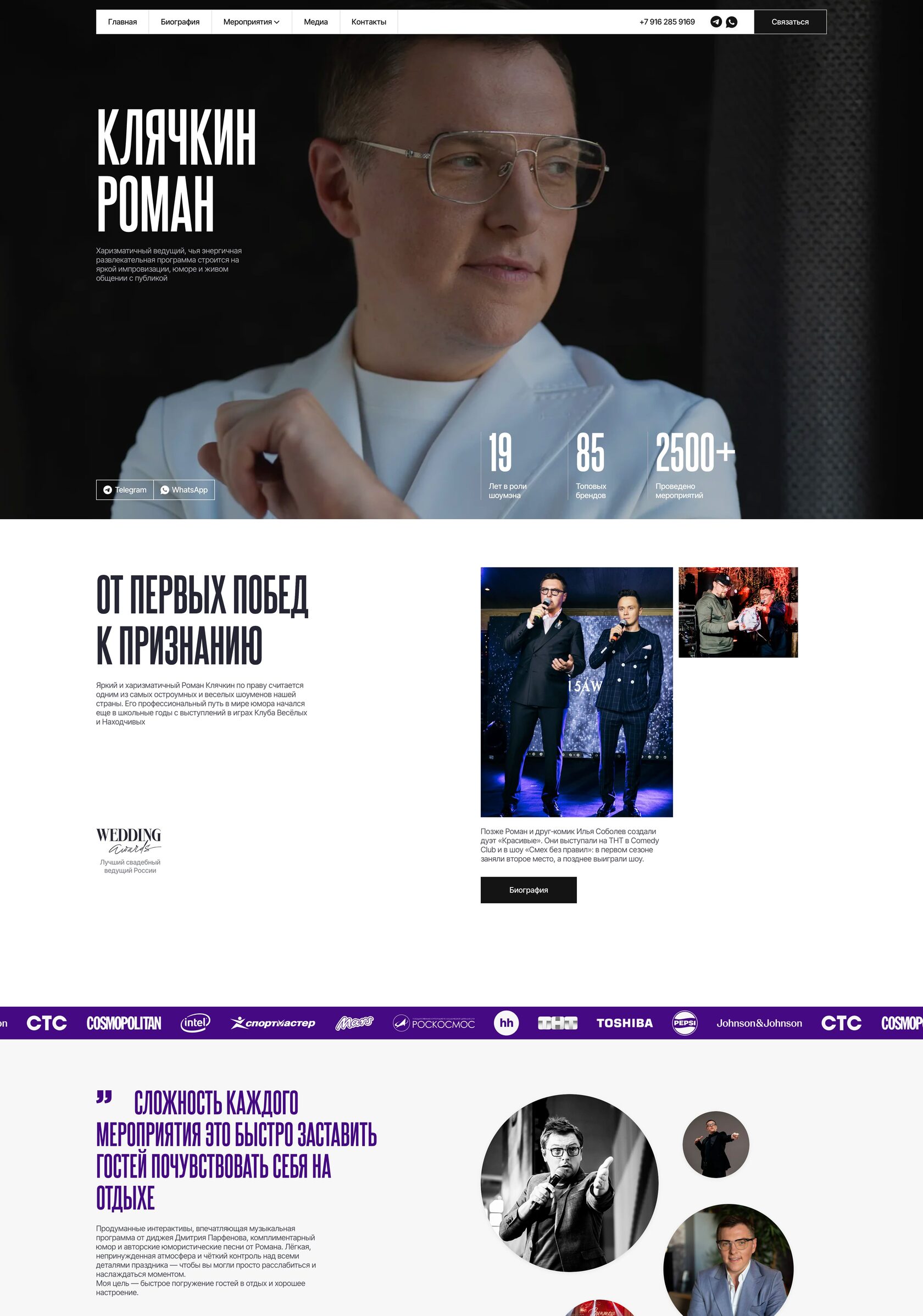 Создать сайт с современным и прогрессивным дизайном. Общая стилистика должна быть минималистичной, в качестве акцентного цвета необходимо внедрить тёмно-фиолетовый — цвет, который используется в других проектах Романа.